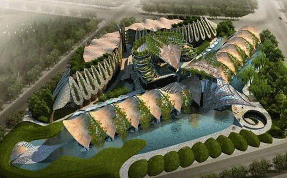 Walking into the building, you will find the surrounding railings decorated with copper leaves and ceramic tiles all over the wall; step in and you can discover the combination of modern elements, such as the ceiling covered with flower petals, the pure white spiral stairs without edges and corners, and the ripple of ceiling. The light between the architectural folds is tortuous and changeable, the visual shocking and artistic flavor are integrated. It makes people feel as if they are in a fairy tale forest, while vision changes as walks on.