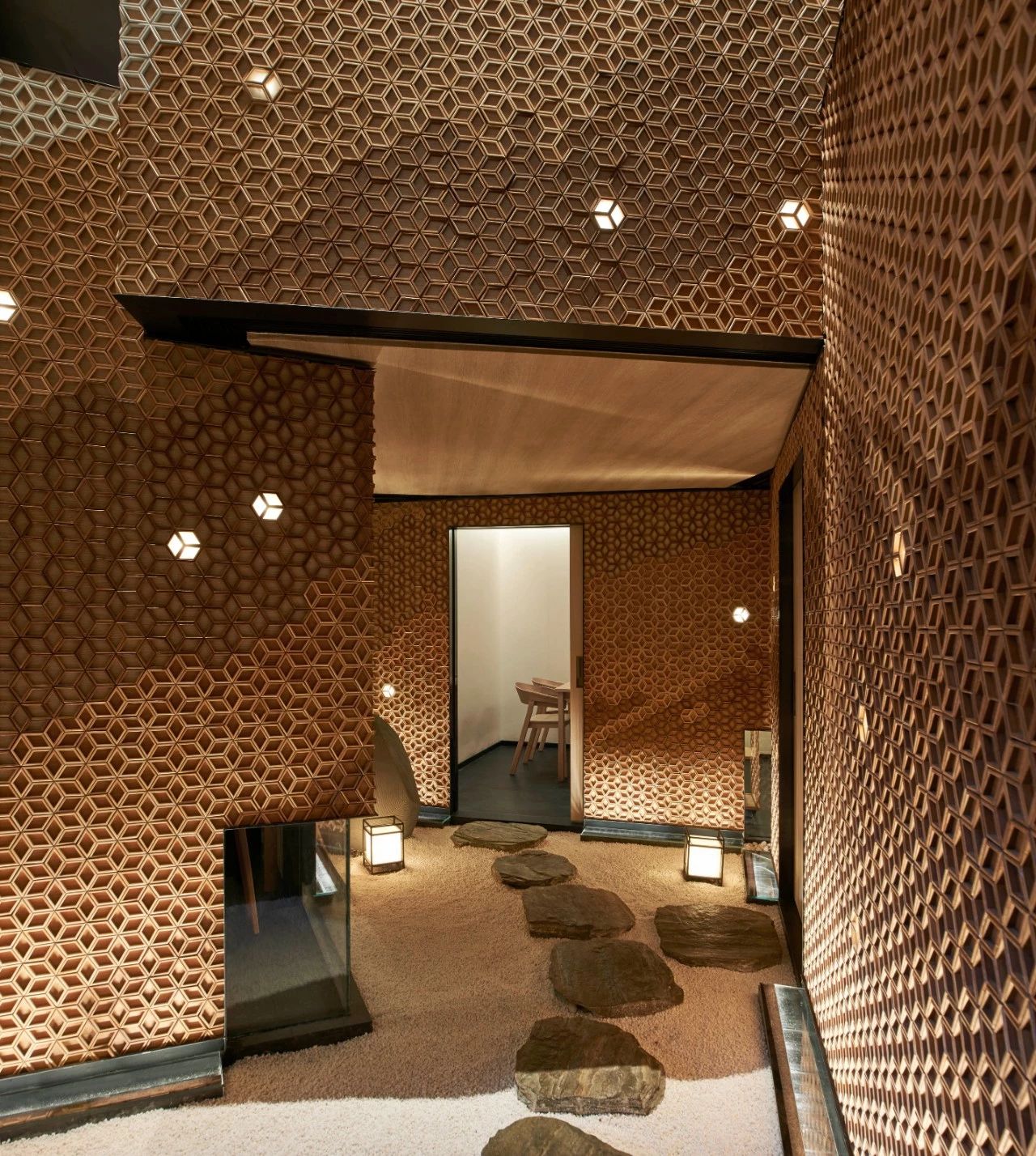 Above the private room, six different types of wood products are used to simulate the dynamic trend of the wind. While ensuring privacy, you can also see through the glass the wood carvings that resemble falling flowers above your head, bringing guests the same pleasant enjoyment as if they were in hanami.